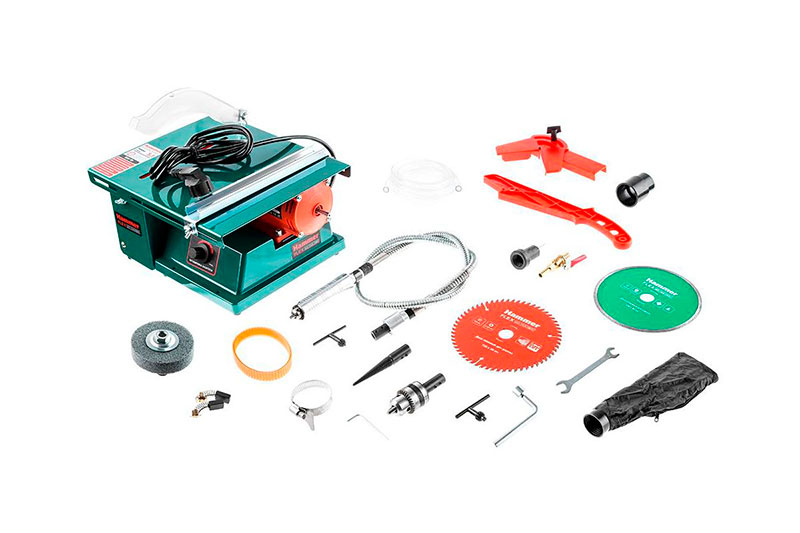 Станок Hammer Flex MFS900 предназначен для резки, сверления, гравировки и шлифовки заготовок из дерева, керамики и металла. Мощность двигателя 900 Вт. Скорость пильного диска достигает 8500 об/мин, патрона гибкого вала – 14000 об/мин. Благодаря широкому функционалу, представляет собой компактную домашнюю мастерскую.