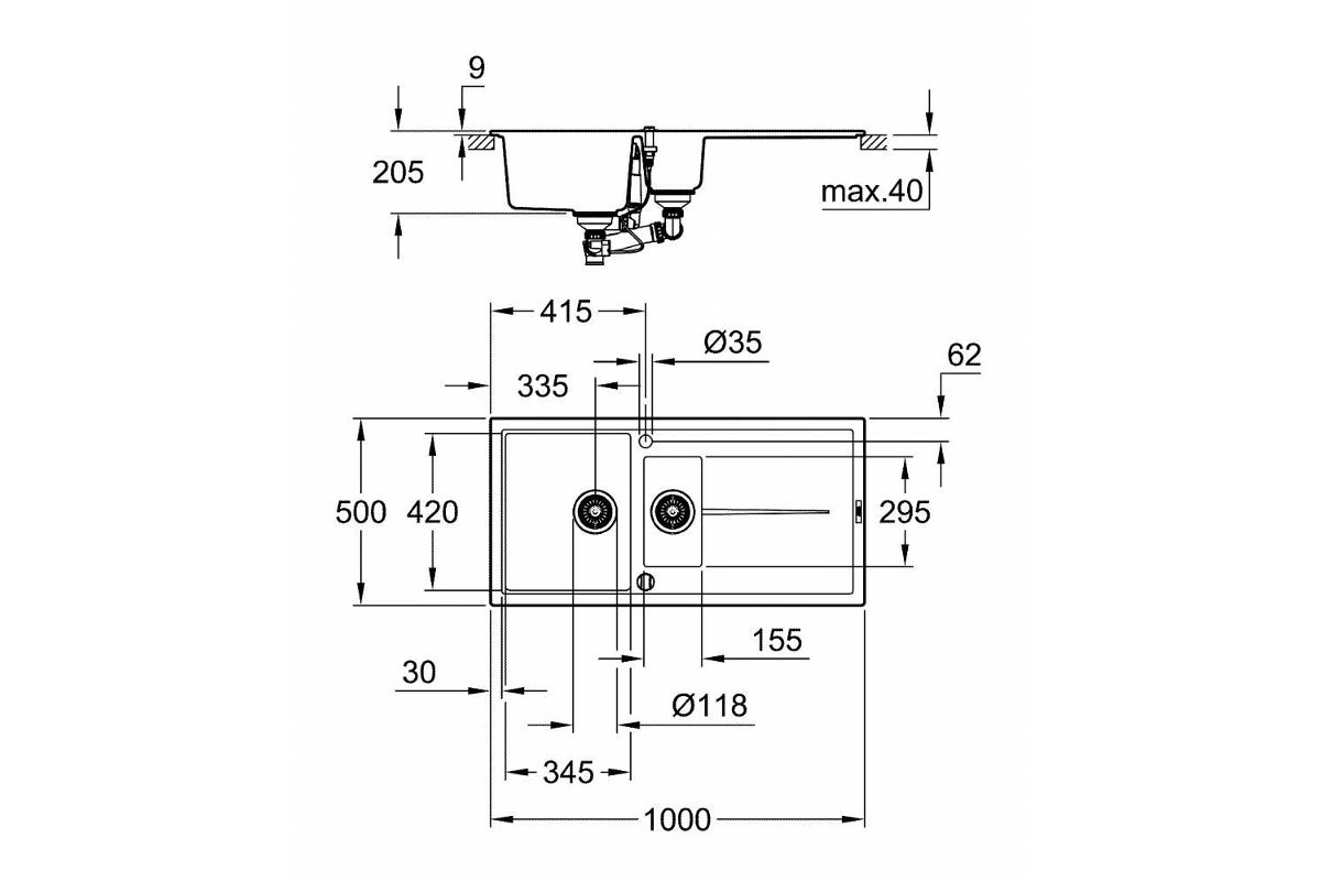 модель: K400 60-C 100/50 1.5 оборачиваемая тип монтажа: стандартная встраиваемая материал: кварцевый композит GROHE Whisper минимальный размер шкафа: 600 мм размеры: 1000 x 500 мм 1 чаша: 335 x 420 x 205 мм 0.5 чаши: 155 x 295 x 146 мм GROHE QuickFix быст