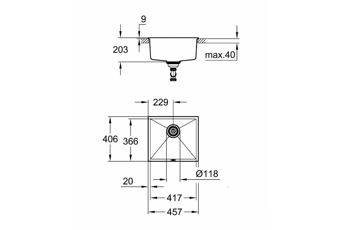 модель: K700U 50-C 45.7/40.6 1.0 тип монтажа: стандартная встраиваемая и под столешницу материал: кварцевый композит GROHE Whisper мин. размер шкафа: 500 мм размеры: 457 x 406 мм 1 чаша: 417 x 366 x 203 мм GROHE QuickFix быстрая монтажная система отверсти
